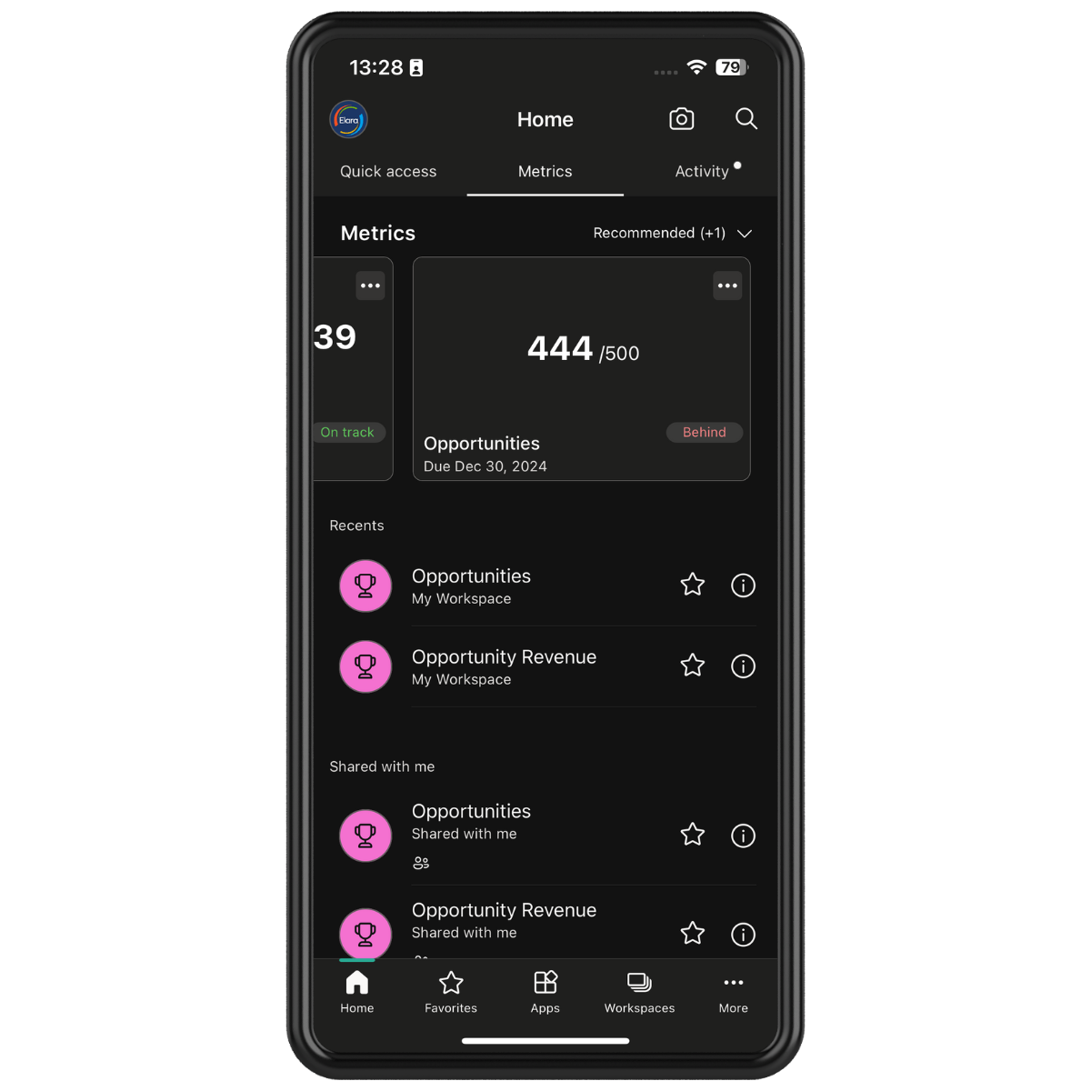 The mobile app gives you an activity pane (seen next to metrics in the photo above) that shows you all of the new comments, mentions, and reports/workspaces assigned to you. Basically anything happening with you and your Power BI team will show here.
